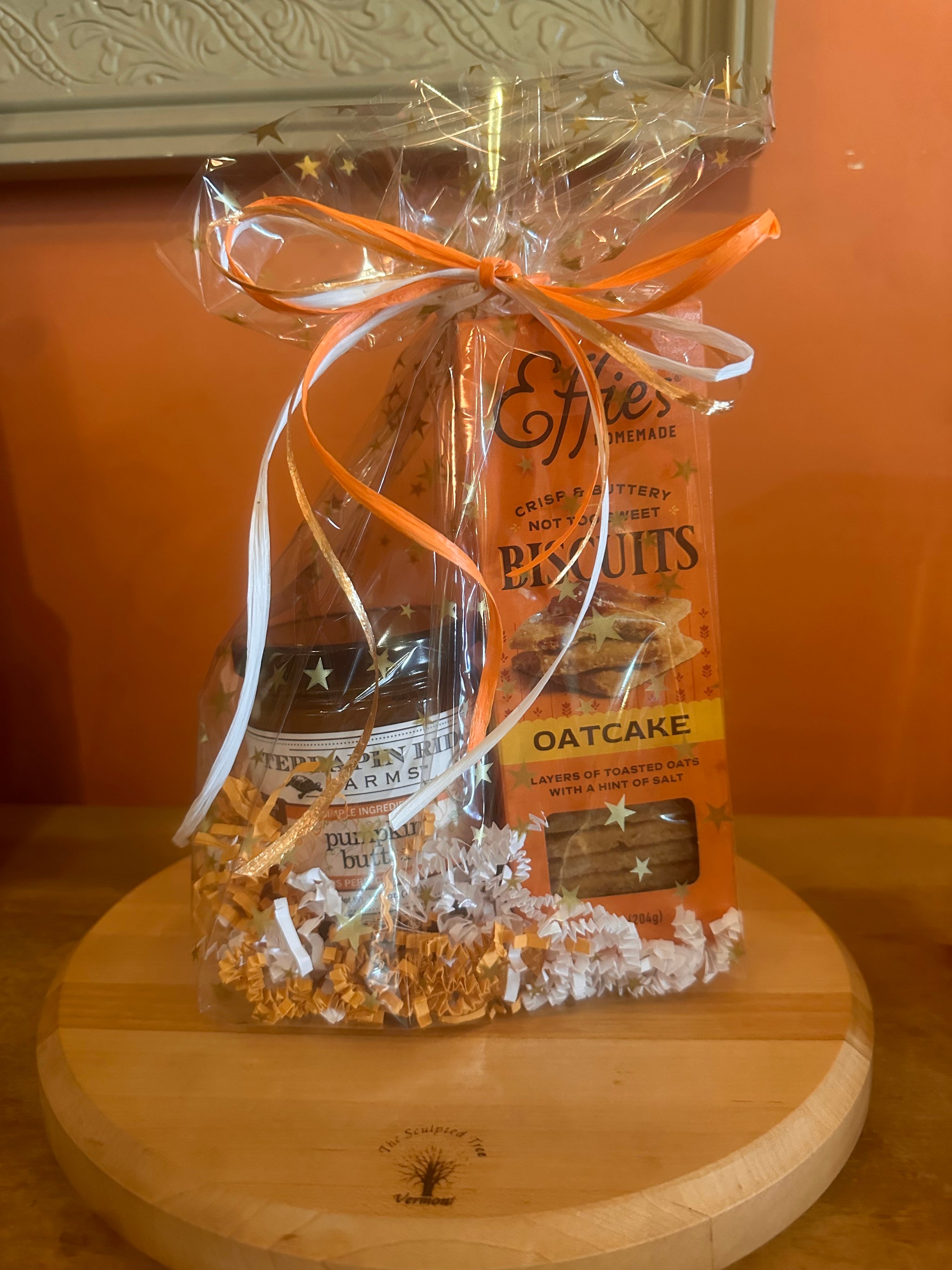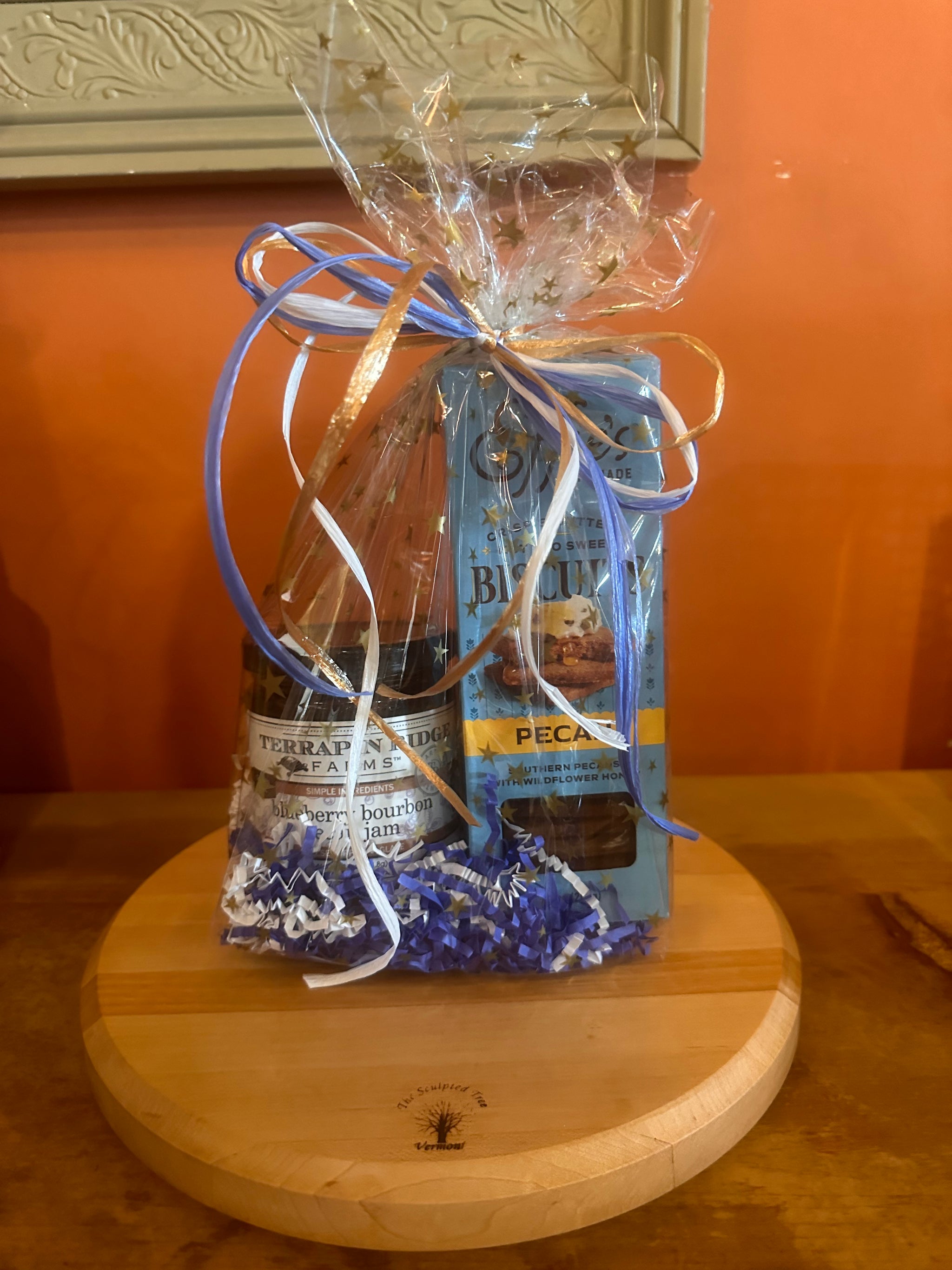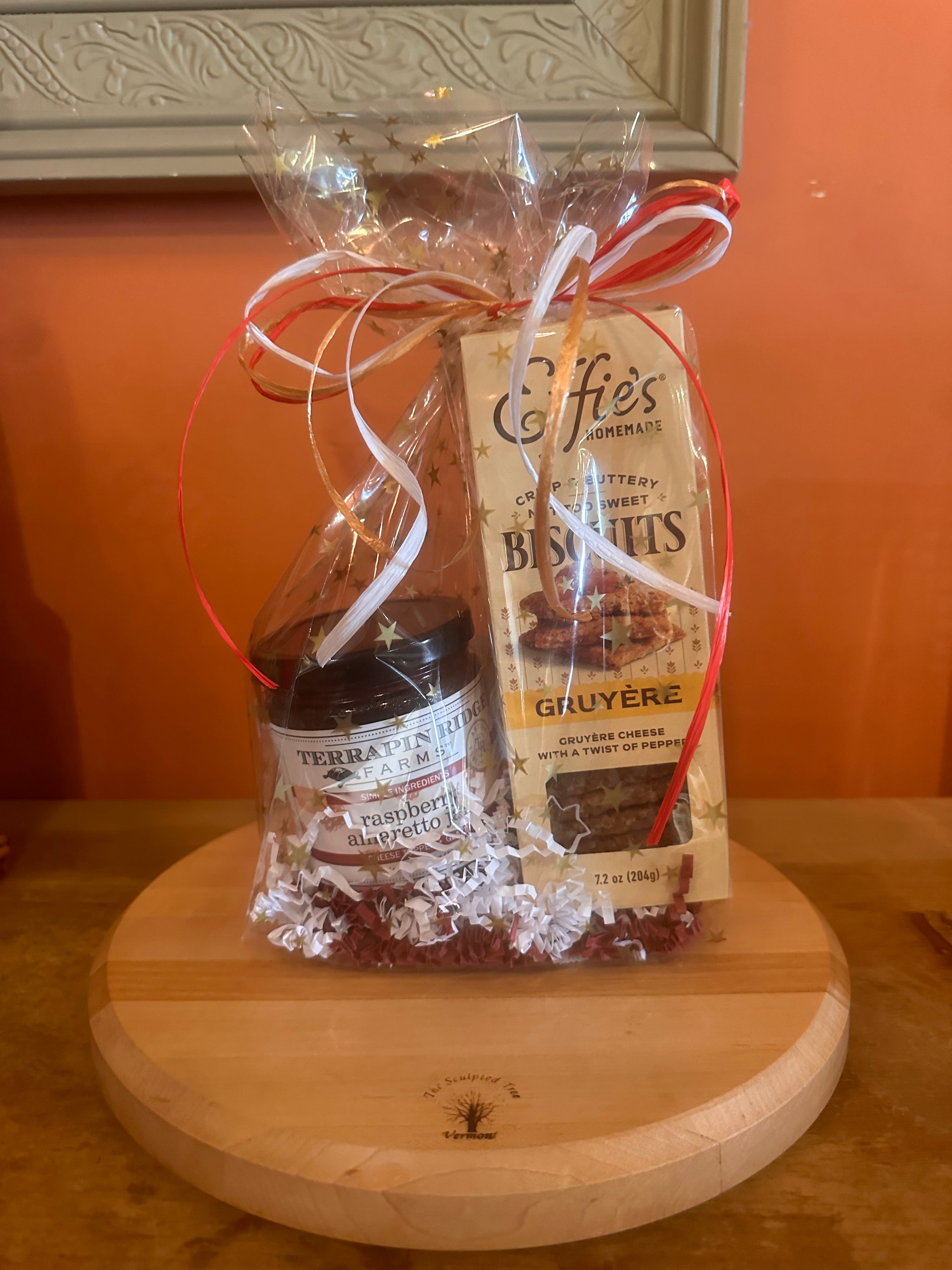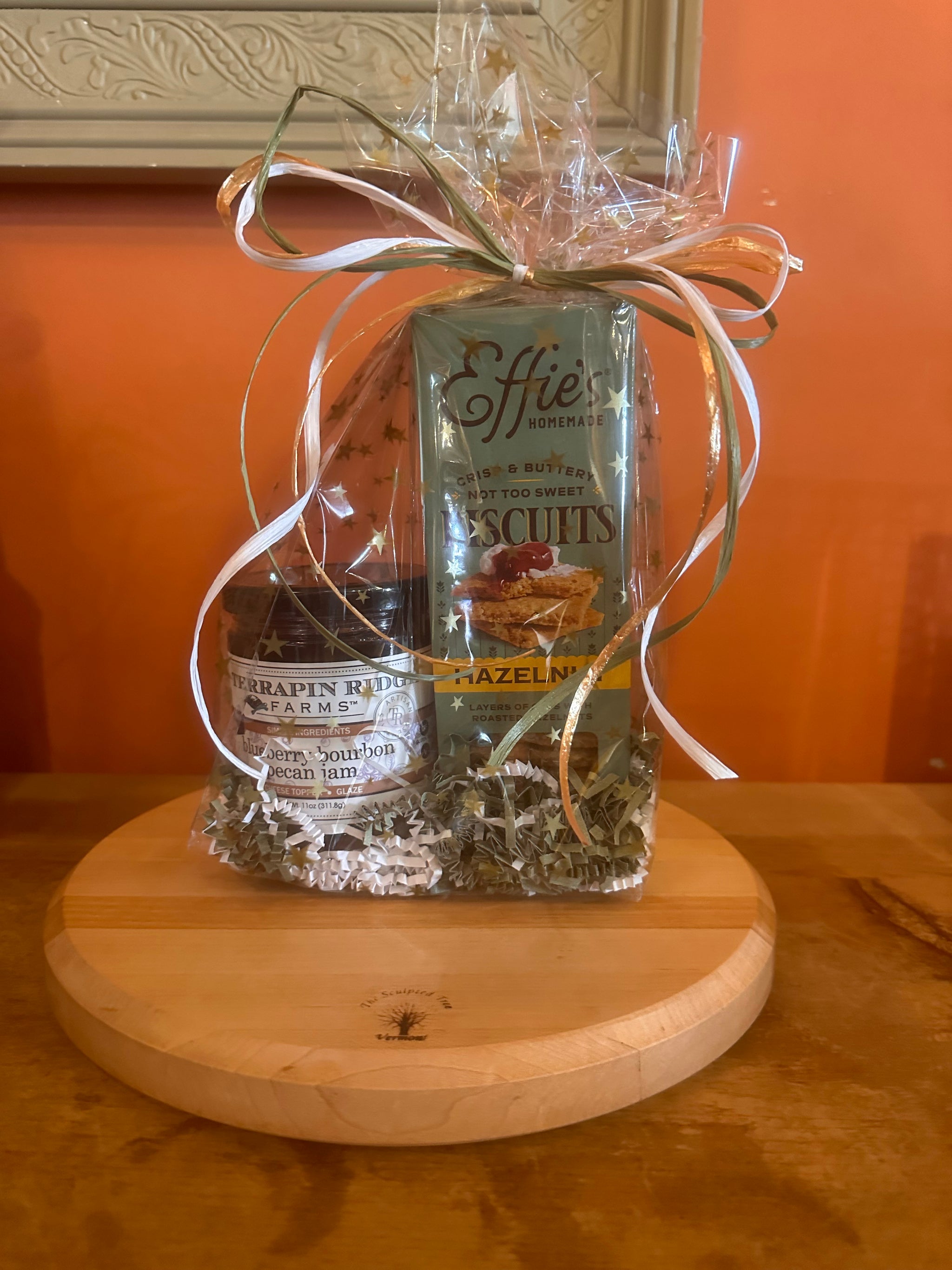 These adorable gift sets make the best hostess gifts! Each bag contains a pairing of Terrapin Ridge Farms spread and a box of Effie's biscuits, wrapped in a cellophane bag with colored paper and a matching ribbon!